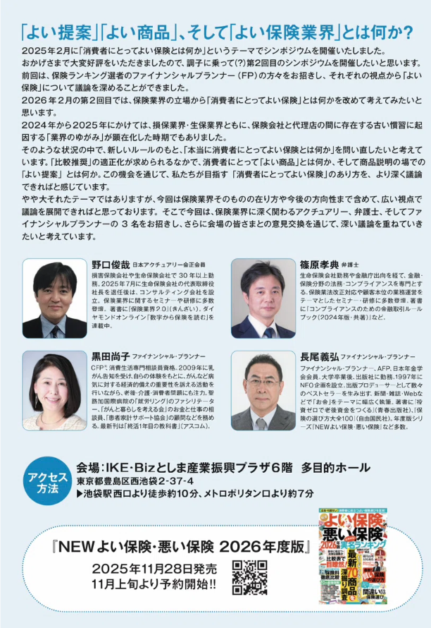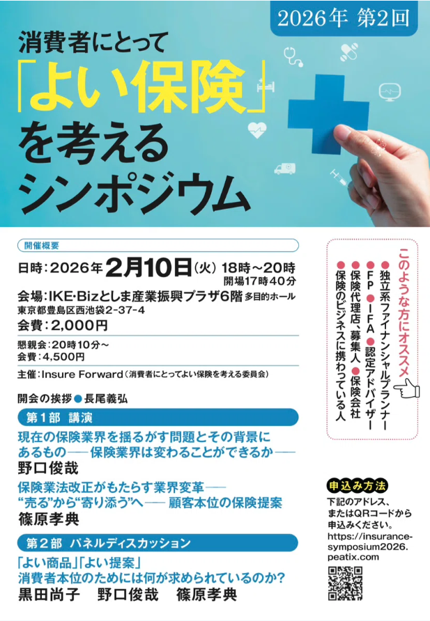<再掲>【お知らせ】2026年2月10日「第2回消費者にとって「よい保険」を考えるシンポジウム2026」開催のご案内 2026年1月26日 みなさん、こんにちは。FP黒田です。 以前もご紹介した2月開催される第2回「消費者にとって「よい保険」を考えるシンポジウム2026」のご案内です。 今回は、黒田がファシリテーター役となります。 すでにたくさんの方がお申し込みをされており、もうそろそろ定員に達する見込みです。 懇親会の方は早々に定員に達してしまい応募を締め切っておりますが、シンポジウム参加だけであればまだ可能だそうです。 詳細やお申し込みはこちら では、みなさん、会場でお目に掛かりましょう! ツイート